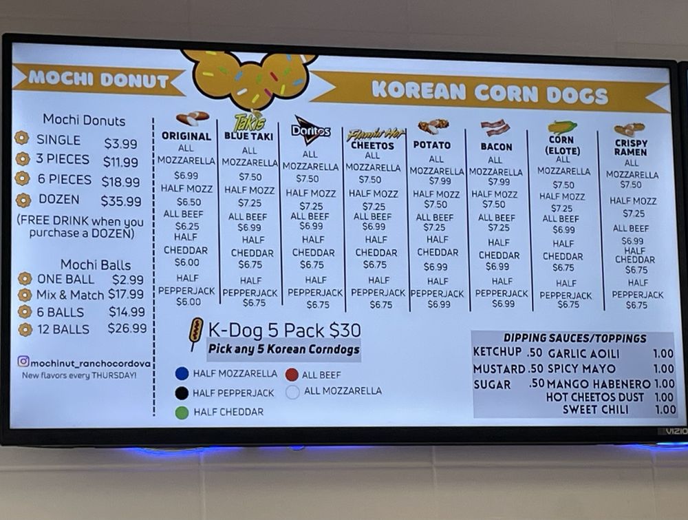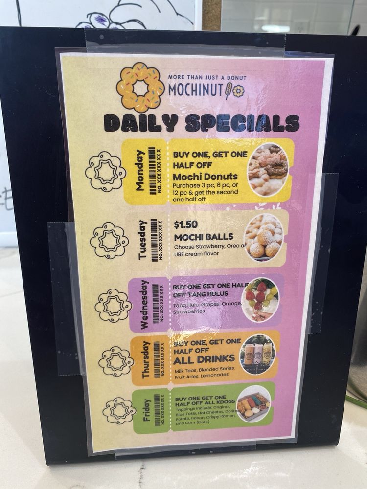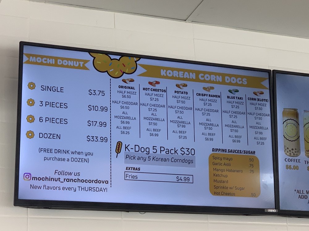 Introducing the menu at Mochinut, a hotspot in Rancho Cordova, CA, offering a unique blend of hot dogs, donuts, and bubble tea. With a classy ambiance and gender-neutral restrooms, this gem also provides outdoor seating and Wi-Fi for a comfortable dining experience. Customers rave about the delicious mochi donuts available in a variety of rotating flavors, along with refreshing bubble tea options. The staff is praised for their friendliness and quick service, making each visit a pleasant one. From lychee and ube flavored donuts to creative Kdogs and milk tea drinks, Mochinut offers a diverse menu that will satisfy any craving. Whether you're a fan of sweet treats or savory delights, this spot is a must-visit for foodies looking to indulge in unique, flavorful offerings.